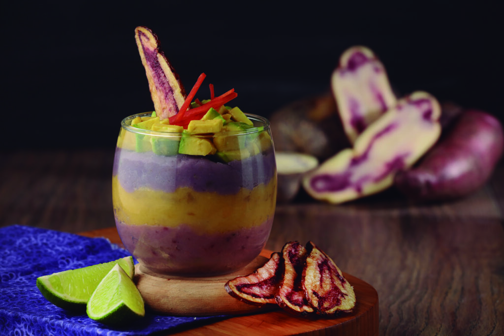 Utilizar un molde circular hueco para colocar una base de puré de criolla, otro de papa pastusa, otro de pacha negra y terminar con la pasta de aguacate.
