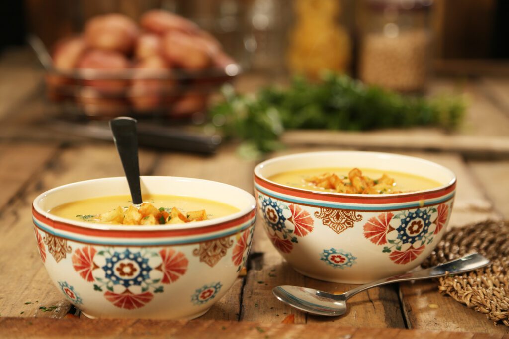 Paso seguido, en una sartén caliente, calentar aceite y sofreír algunos cubos de papa, sobrantes de la primera cocción en el caldo de pollo. Agregar la crema de papa y terminar la cocción. Por último, agregar un chorro de crema de leche, cocinar por un par de minutos más, salpimentar antes de servir y espolvorear perejil finamente picado. Presentar en un plato hondo. Decorar y servir.