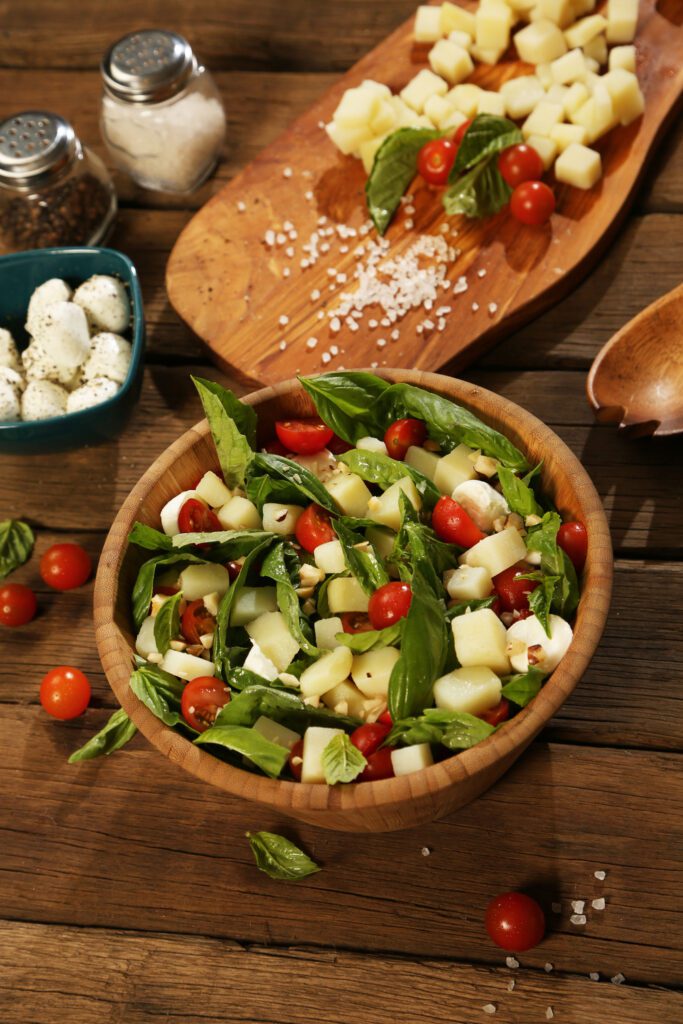 Preparación: Precocer la papa cortada en cubos por 10 minutos, escurrir y saltear en un chorro de aceite de oliva, con los tomates cherry partidos a la mitad, dejar atemperar, espolvorear un poco de sal y pimienta. Posteriormente, fuera de la sartén, en un bowl, agregar la mezcla, los cubos de queso mozzarella, las nueces troceadas y las hojas de albahaca lavadas y secas. Servir.