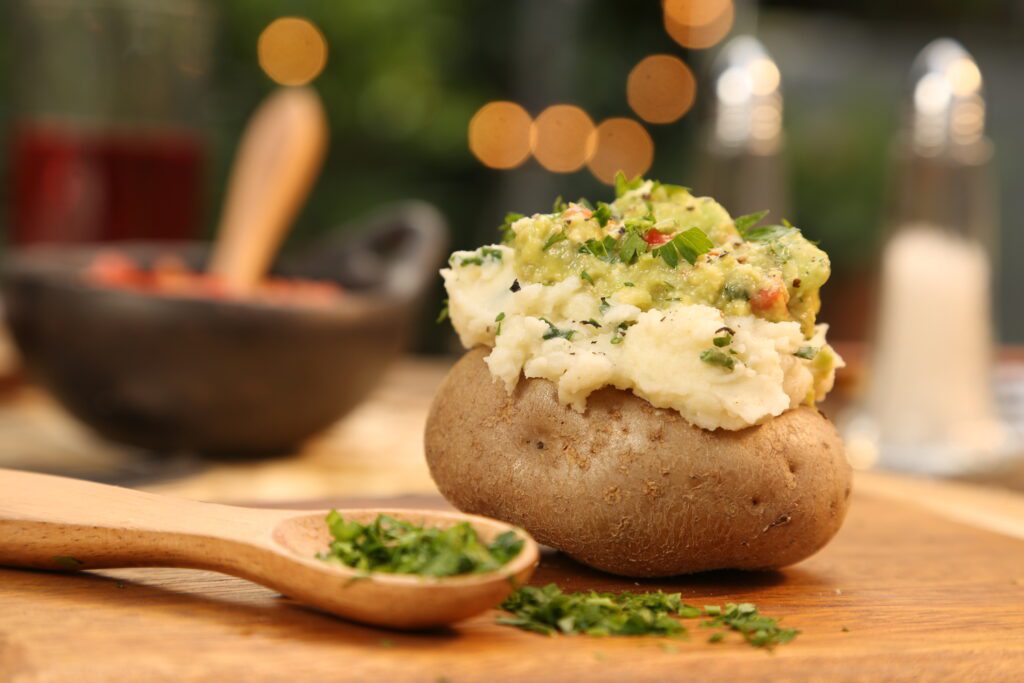 Hacer un puré con el relleno de papa extraído y mezclarlo con la mantequilla, la crema de leche, el cebollín picado finamente y chorrearlo con un poco de aceite de oliva. Salpimentar y volver a llenar la papa con la mezcla. Con el papel aluminio, envolver la papa por los costados, sin cubrir el relleno. Llevar a horno precalentado a 180 – 200 grados centígrados, por unos 10 minutos hasta que dore. Para el guacamole, quitarle la piel a un aguacate mediano maduro, extraer su pulpa, licuarla con un poco de zumo de limón, aceite de oliva, sal y pimienta. Agregar cilantro picado finamente, revolver y reservar. Sacar las papas en aluminio del horno, dejarlas enfriar un poco, disponer un poco guacamole encima de cada una y servir.