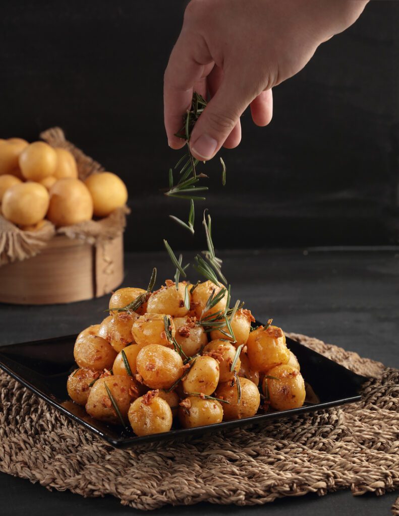 Llevar la mantequilla a fuego bajo, con la ayuda de una cuchara retirar el exceso de espuma hasta que quede transparente, agregar el romero, la paprika y el ajo finamente picados, seguir cociendo a temperatura muy baja por 15 minutos, terminar con sal y crema de leche; agregar las papas criollas previamente cocidas con piel y dejar al fuego por 5 minutos.