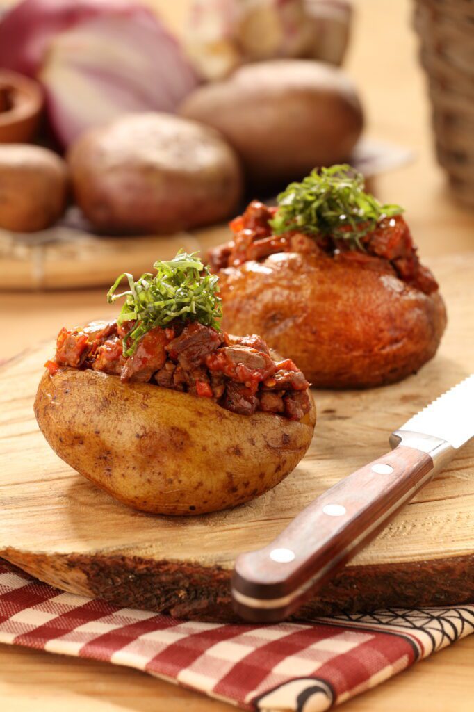 Lavar y cocinar las papas con la piel por 30 minutos, retirar del fuego y con la ayuda de una cuchara retirar parte de la pulpa de la papa haciendo un orificio y rellenar con la cebolla salteada, el ajo, el ají y la carne previamente picada terminada con salsa de soya.