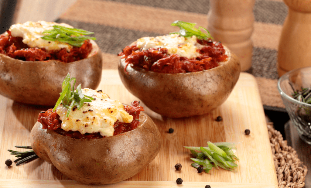 Lavar muy bien las papas y con la ayuda de un cuchillo de oficio realizamos un corte en la parte superior y retirar un 60% del almidón, espolvorear con sal, pimienta, aceite de oliva, romero y ajo, colocar en una bandeja y cubrir con aluminio, llevar al horno por 30 minutos o hasta que esté tierna la papa. Por otro lado lavar la panela al fuego con 100 ml. de agua, agregar el jengibre y la soya y reducir. Cubrir la costilla con la mezcla de panela, soya y jengibre, hornear a fuego bajo por dos horas en el horno. Desmechar, mezclar con bbq, rellenar y cubrir con queso mozzarella. Gratinar y servir.