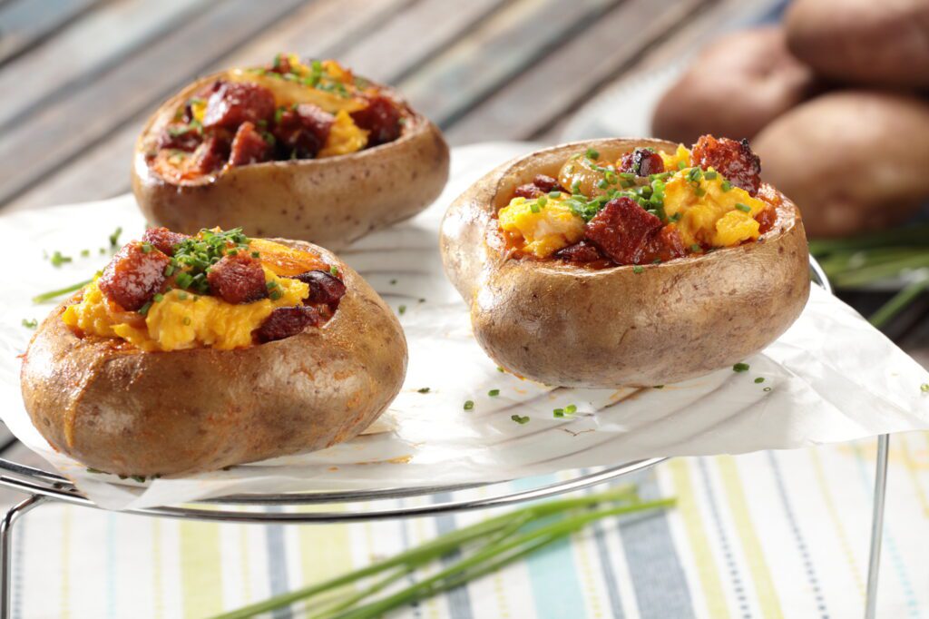 Lavar la papa, cocerla con piel en el horno a 180 grados por 40 minutos; con la ayuda de una cuchara, retirar parte del relleno y reservar. Saltear en aceite de oliva, la cebolla picada en rodajas, esperar hasta que quede traslúcida; agregar el chorizo, el estragón y salpimentar, enfriar la mezcla y unir con los huevos batidos, verter la mezcla en las canastillas de papa y hornear a 160 grados por 5 minutos; decorar con cebollín.