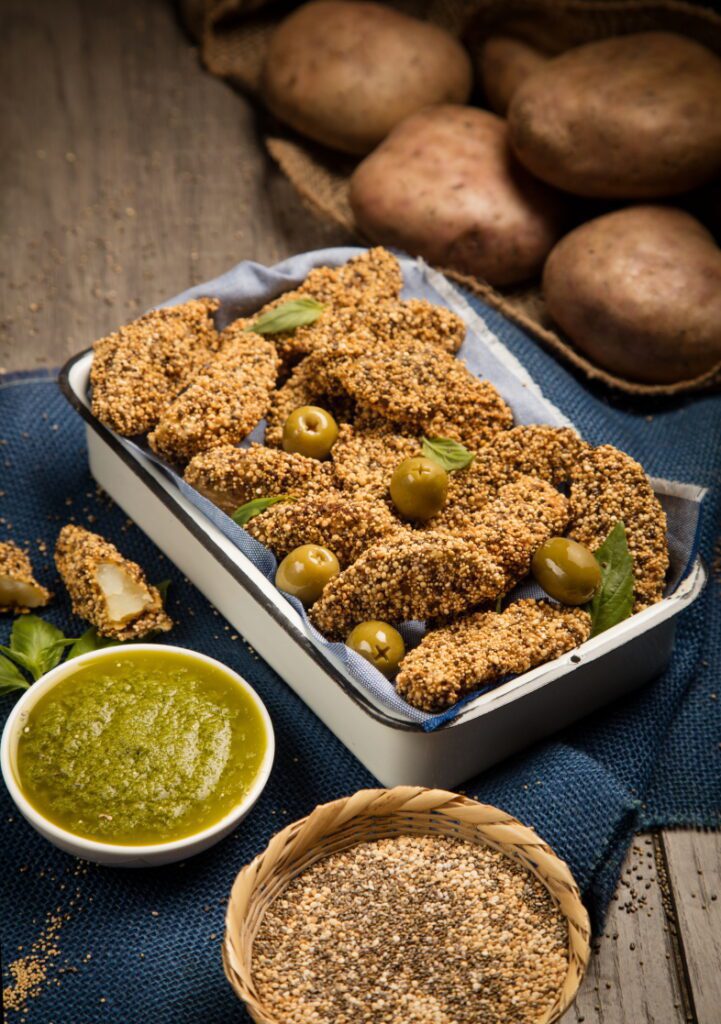 Lavar las papas con piel y cortarlas en cascos; en un tazón, poner a calentar agua con sal, agregar las papas y precocer durante 15 minutos; retirar y cubrir con un poco de aceite de oliva, reservar. Cocinar la chía en el doble de agua o caldo de vegetales (160 ml) durante 15 minutos o hasta que abra, dejar enfriar. En una bandeja panda, mezclar la quinua, con el amaranto y la chía. Pasar las papas por la harina de quinua y luego por el huevo batido, terminar escarchando con la mezcla de semillas andinas, de tal forma que los cascos de papa queden bien cubiertos. Freír en abundante aceite por 3 minutos, retirar y reservar. También se puede hornear durante 15 minutos o hasta que dore. Para la salsa, procesar las aceitunas con la albahaca y el aceite hasta lograr una textura suave tipo dip, verterla en un recipiente para llevar a la mesa.