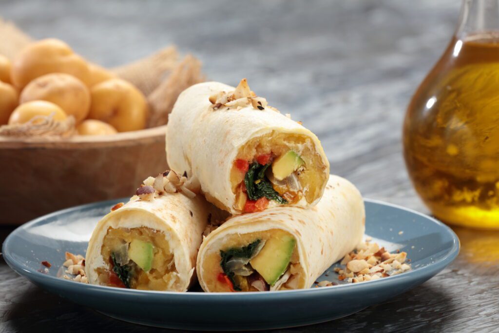 Para armar, esparcir el queso crema sobre la tortilla, puré de papa, aguacate, los vegetales salteados, la nuez y enrollar. Cortar en bocados.